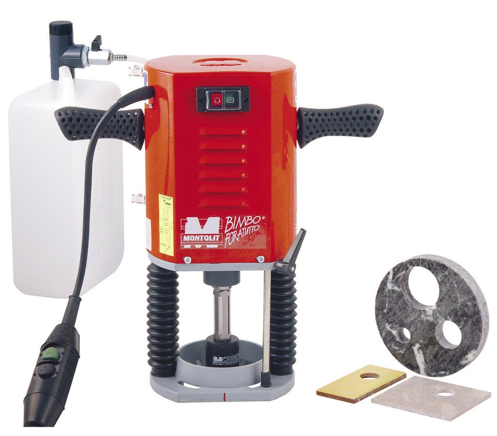 BIMBO - elektrická, vodou chlazená vyvrtávačka pro diamantové korunky a frézy průměru 5 -120 mm do keramické dlažby, kameniny a kamene. Lze vyvrtávat otvory ve více dlaždicích najednou.