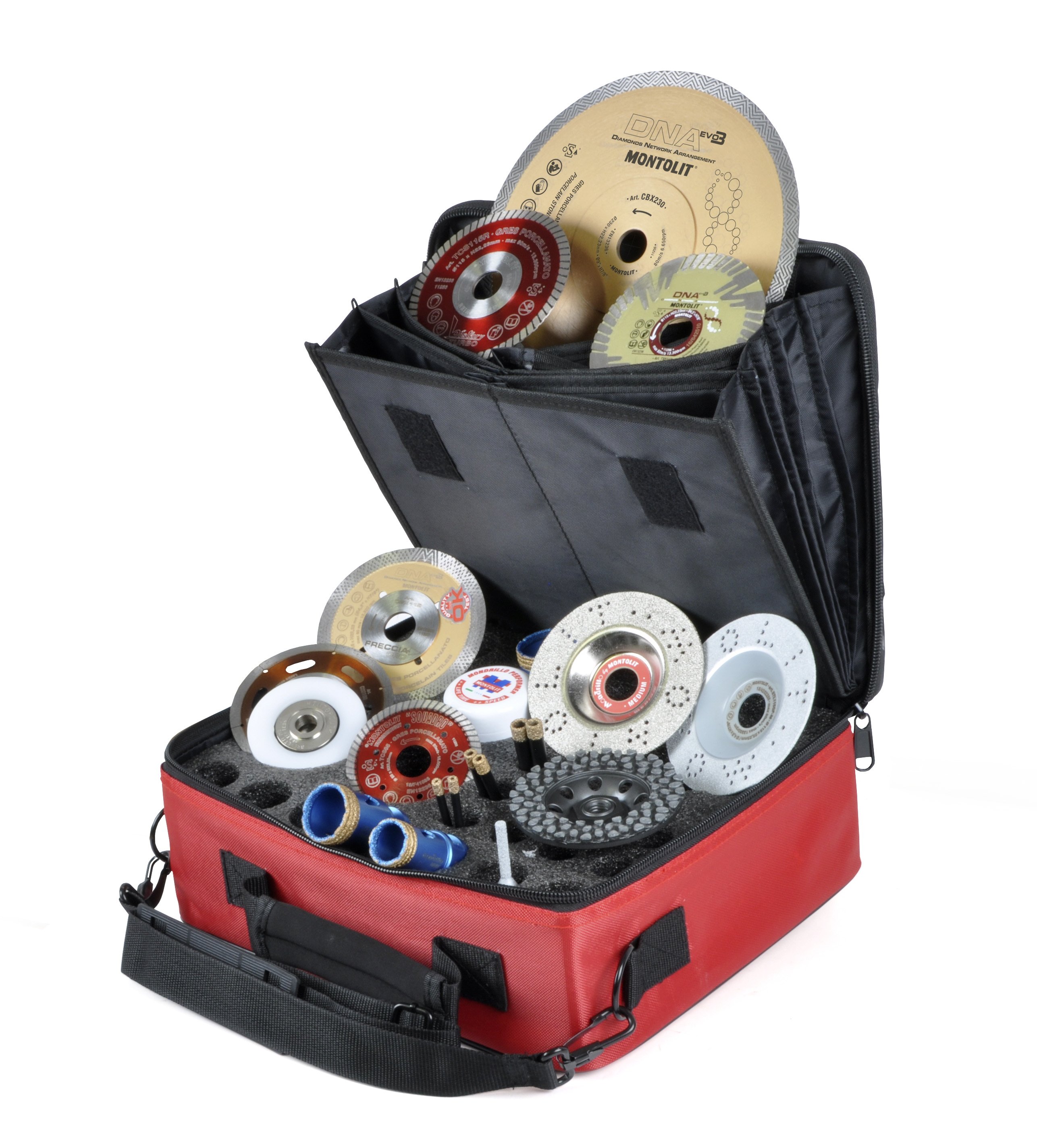 Obsahuje kapsy různých velikostí pro diamantové korunky a frézy a diamantové řezné a brusné kotouče.